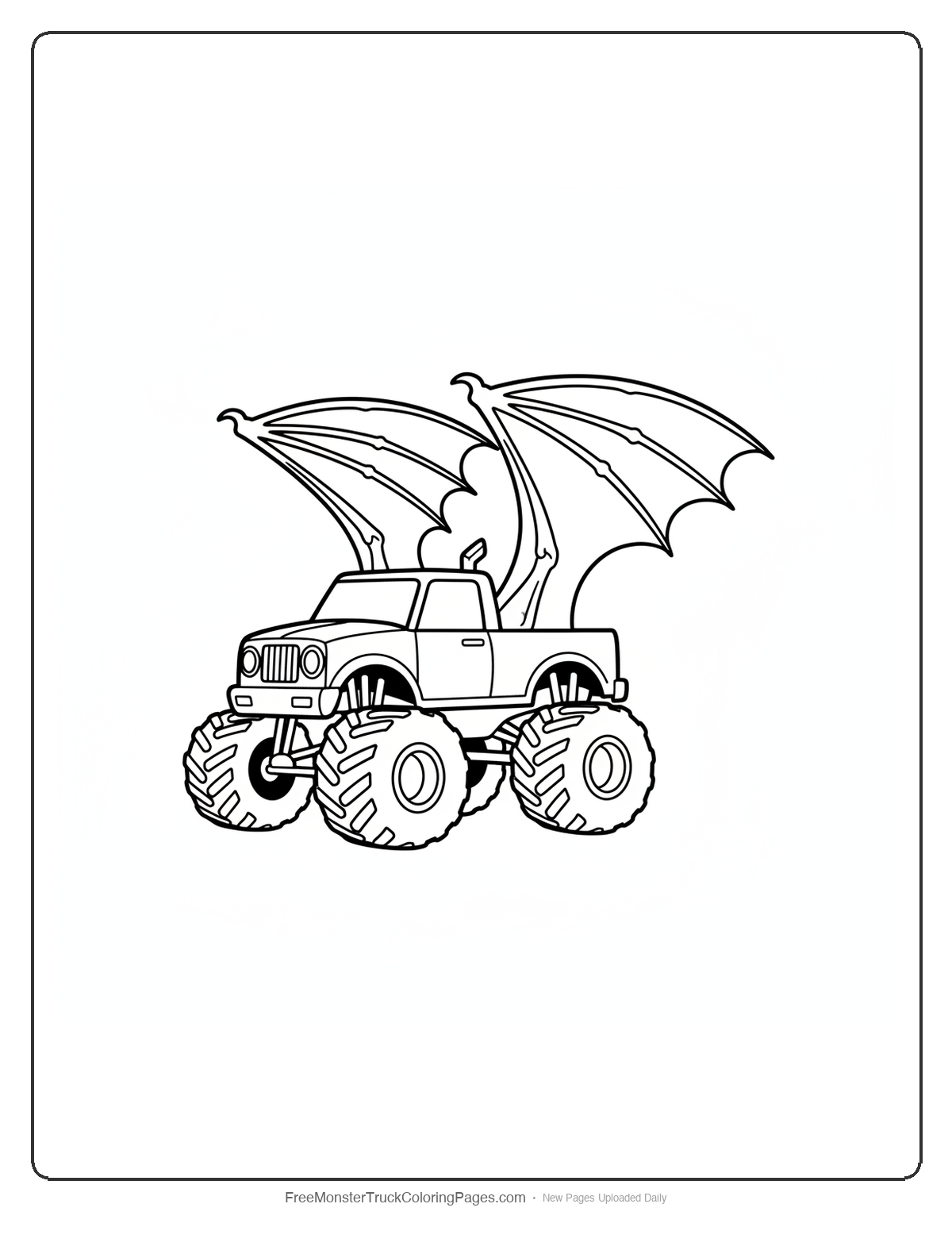 This adorable little monster truck has small rounded bat wings on its fenders, big round friendly eyes, and two tiny fangs poking down from the front bumper. Super cute and easy to color!