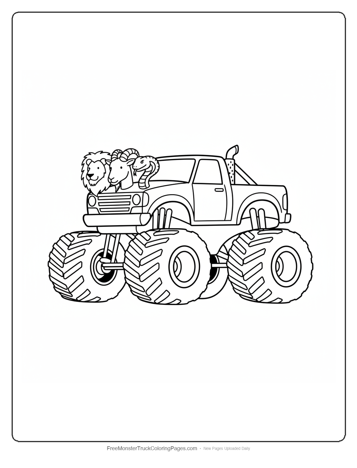 Free printable chimera monster truck coloring pages for kids ages 2-8. Lion jaws, goat horns, serpent tails, dragon wings — every truck mashes up multiple mythical beasts into one wild ride. Bold outlines, ready to print!