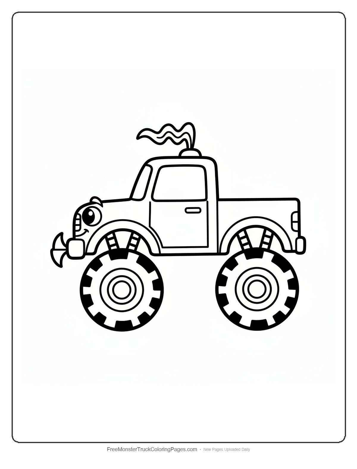 A cute little monster truck with two small fangs on the front bumper, a forked tongue shape as the antenna, and big round friendly eyes as headlights. Simple and adorable — perfect for the youngest colorers!