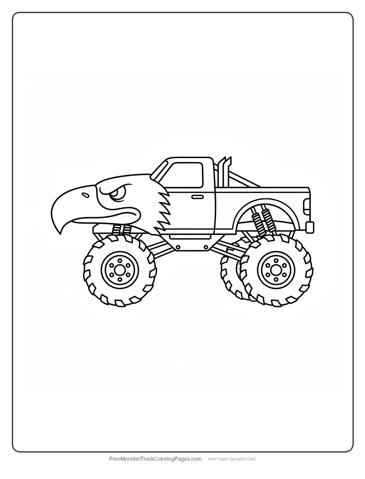 Free printable eagle monster truck coloring pages for kids ages 2-8. Beak-shaped bumpers, talon wheels, wing doors, feather spoilers — every truck has a unique eagle-inspired structural design. Bold outlines, ready to print!