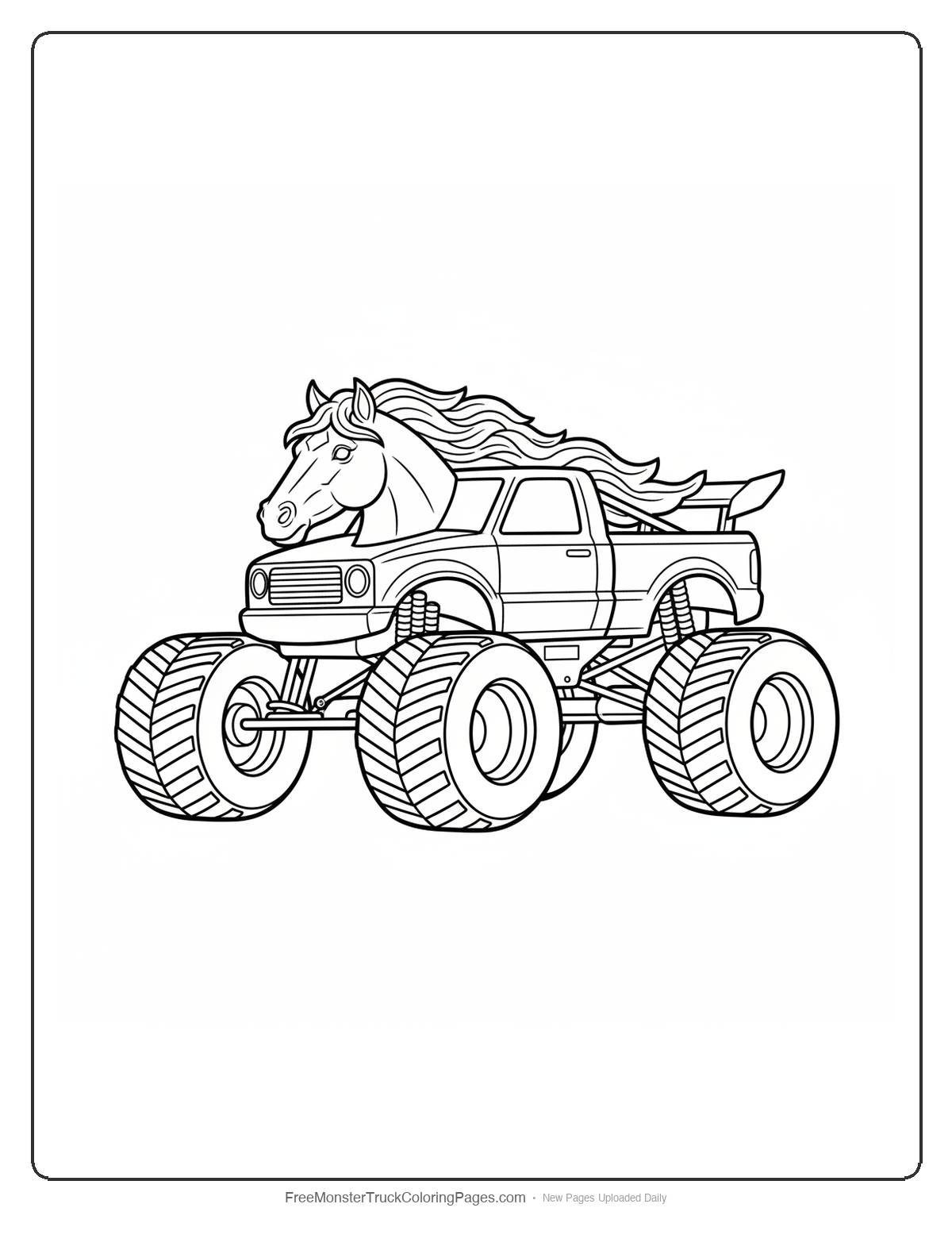 Free printable Pegasus monster truck coloring pages for kids ages 2-8. Wing doors, horse head hoods, feathered exhaust, hoof wheels, mane spoilers — every truck is built with mythical winged horse power. Bold outlines, ready to print!