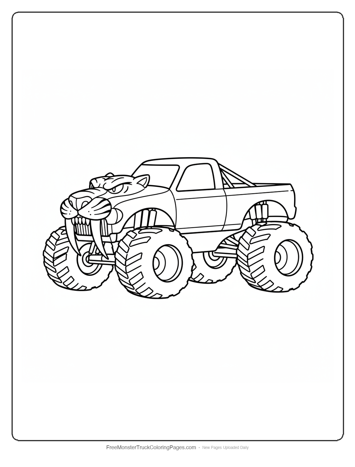 Free printable tiger monster truck coloring pages for kids ages 2-8. Saber-tooth fangs, tiger claw hood scoops, cage cabs, and pouncing stances — every truck has a unique tiger-inspired design. Bold outlines, ready to print!
