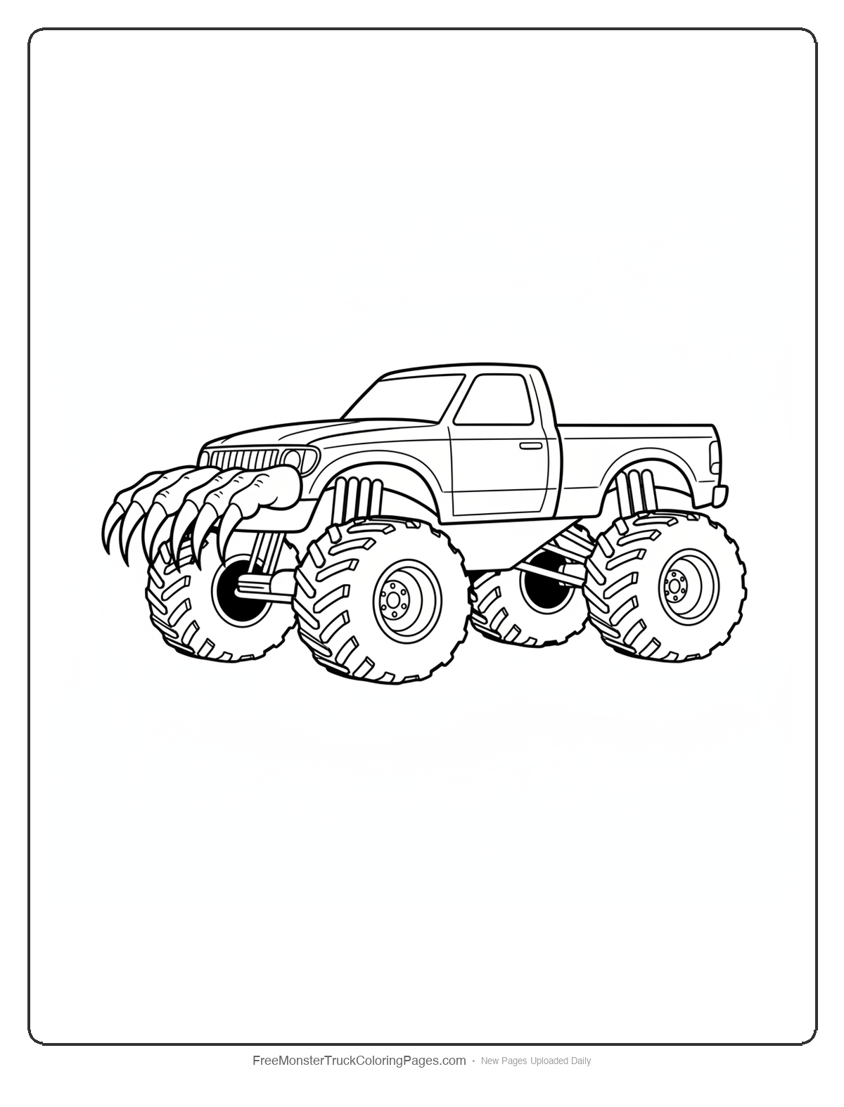 This monster truck means business! The entire front bumper is shaped like two massive werewolf claws curling forward, ready to grab anything in its path. Thick curved talons jut out from each side of the grille.