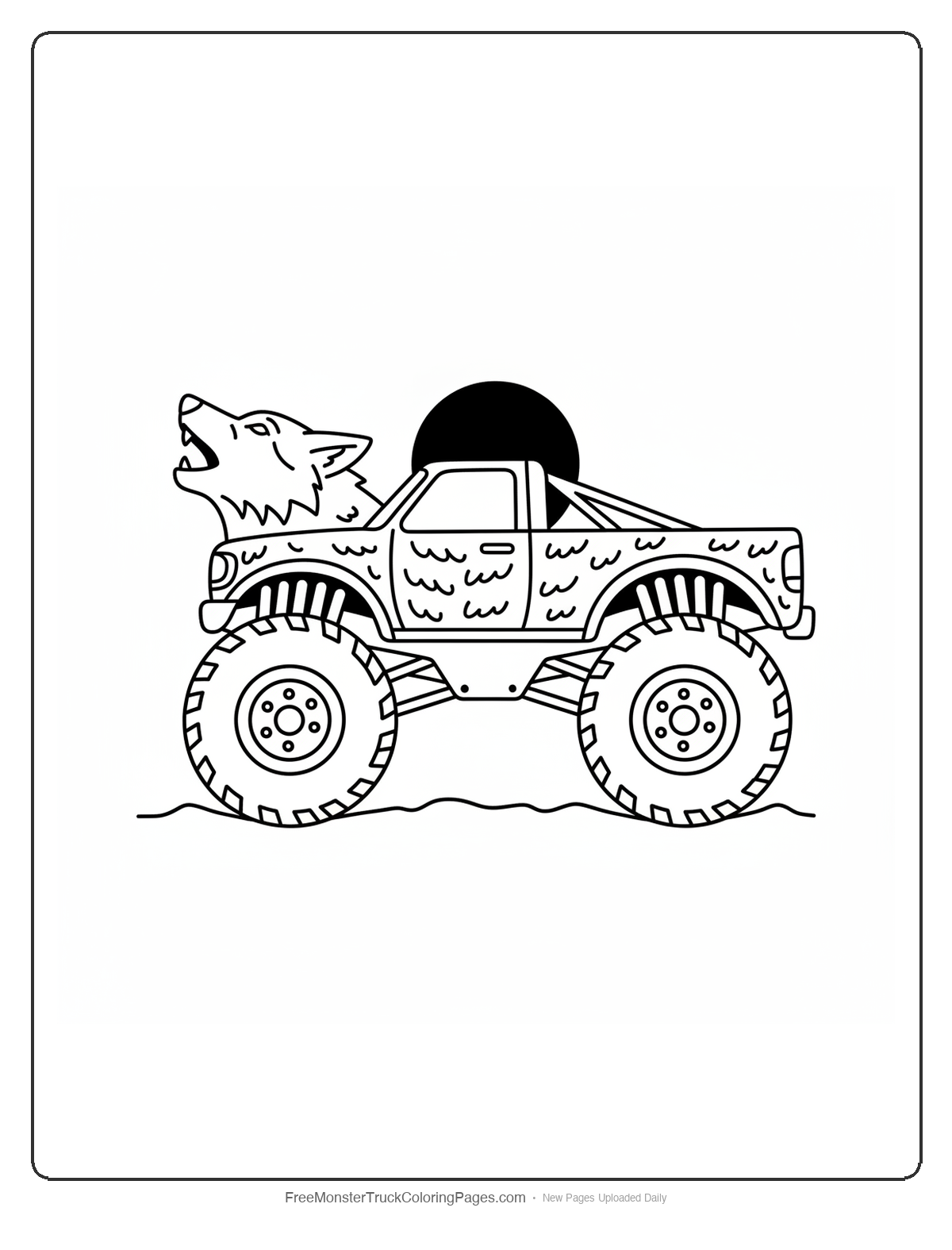 Free printable wolf monster truck coloring pages for kids ages 2-8. Howling wolves, wolf pack crushers, arctic wolves, and werewolf transformations — all on monster trucks with massive wheels. Bold outlines, ready to print and color!