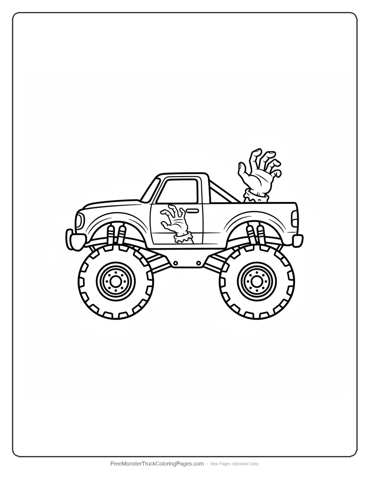 A large cartoon zombie hand reaches up right out of the hood of this monster truck, fingers spread wide! The hand is part of the truck's body design, rising from the center of the hood like it's bursting through. Silly and spooky fun!